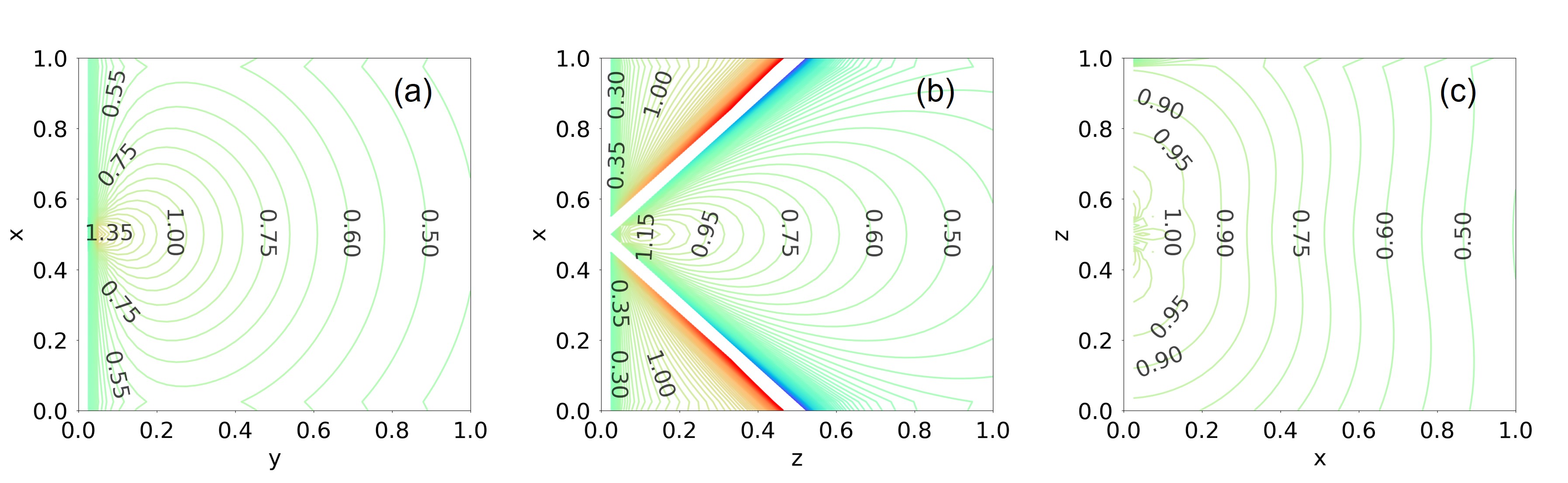 图 1:针对(a)扭转、(b)倾斜和(c)外延三种基本GND带构型,通过比较DD计算应力场与超级位错弹性应力场之间的比率,以确定尺寸效应引起的应力场缩放系数。