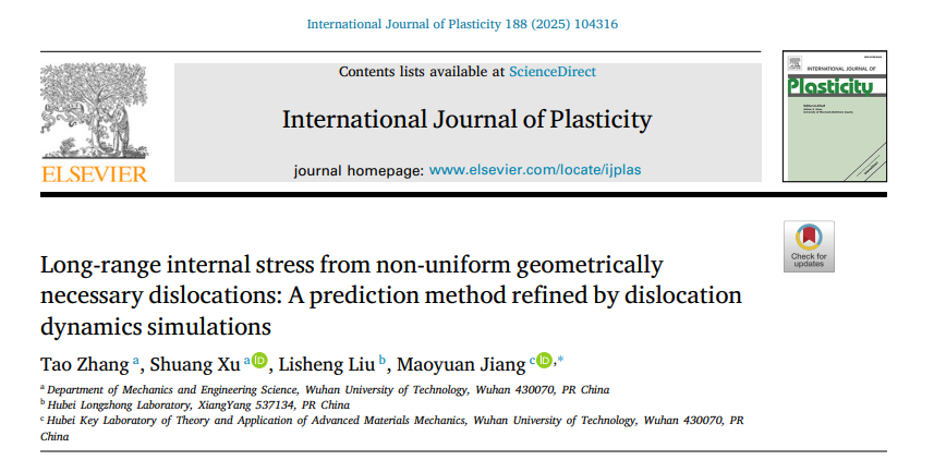 发布时间:2025-04-18近日,PA捕鱼官方网站计算力学理论与工程应用团队在固体力学领域顶级期刊International Journal of Plasticity(中科院一区Top期刊,IF9.4)上发表了题为“Long-range internal stress from non-uniform geometrically necessary dislocations: a prediction method refined by dislocation dynamics simulations”的最新研究成果。论文由张涛、徐爽、刘立胜和蒋茂圆合作完成,其中硕士研究生张涛为第一作者,蒋茂圆副教授为通讯作者。这是本校力学学科独自在IJP上发表的一篇重要学术论文,该研究得到了中国国家自然科学基金(12472068,12102313,52494933)的大力支持。论文链接:https://doi.org/10.1016/j.ijplas.2025.104316。
