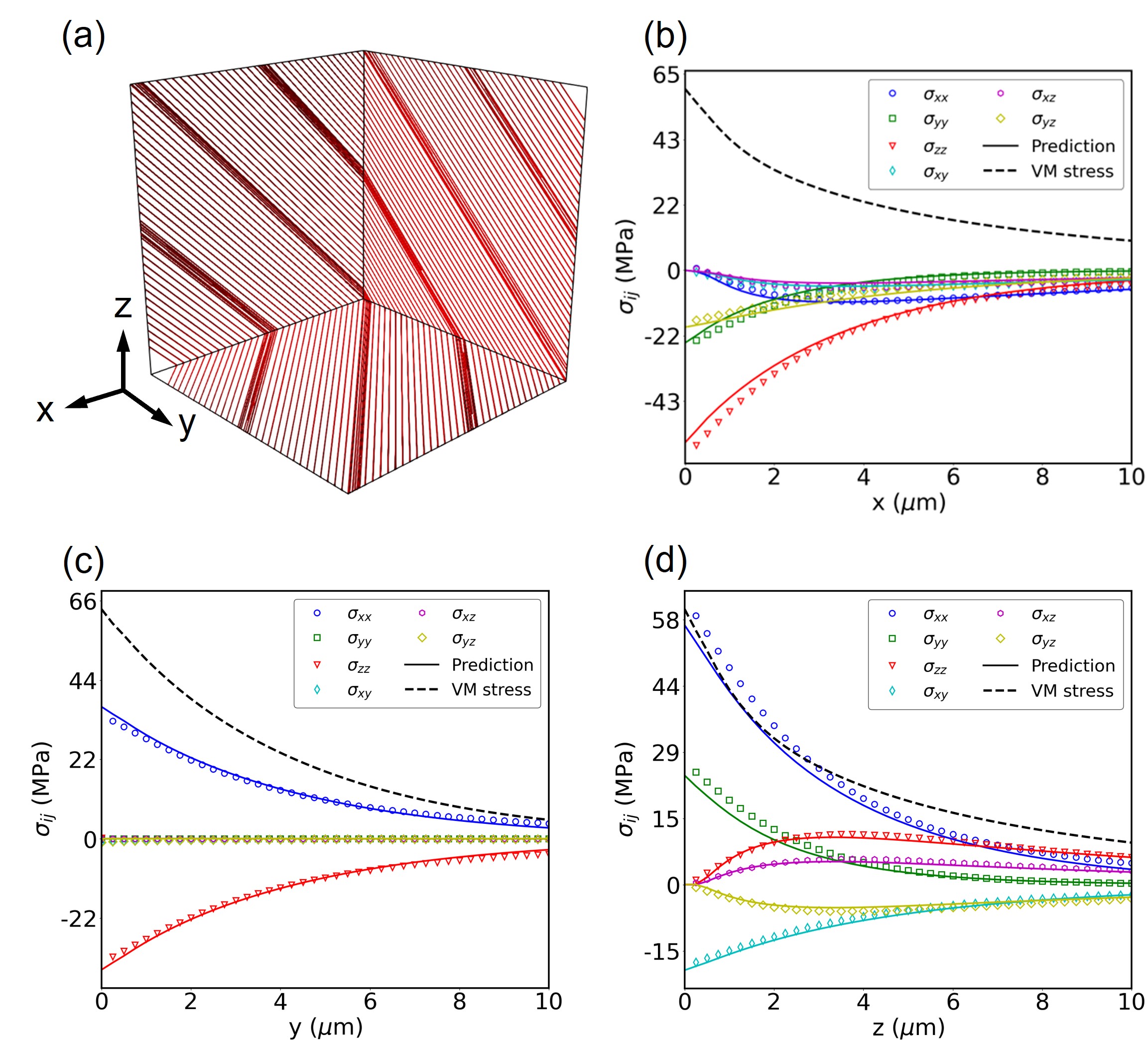 图2:(a)面心立方晶粒中,具有非均匀GND分布特征的三个正交晶界。(b-d)平均长程内应力预测结果与DD仿真结果的比较。