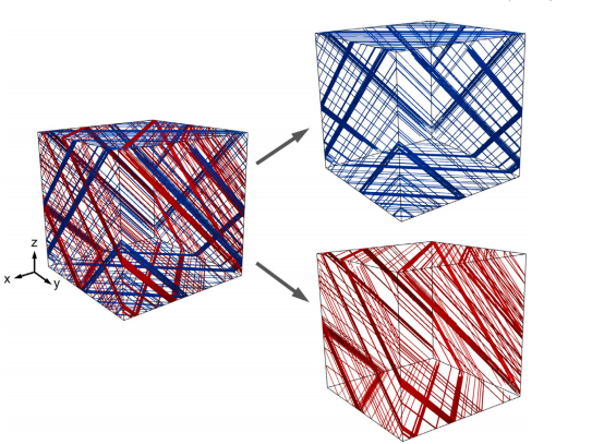 研究进一步指出,表面GND密度可以用于准确描述晶界处位错分布的波动性,从而明确高位错密度GND带的空间分布特征。基于平均表面GND密度,开发了一种考虑位错非均匀性的平均长程内应力计算方法。其核心在于,在遵循滑移系与晶界的几何关系条件下,将任意GND面分解为包含三种基本GND面构型的集合。在小变形假设下,首先确定表面GND密度张量中各分量对应的应力分量,然后将各应力分量求和以得到GND面对应的应力场。在单滑移系激活条件下的面心立方晶粒中,该方法成功实现了GND面的平均长程内应力预测。正如图2所示,对于包含GND带的三个正交晶界面,该方法的应力预测结果与DD仿真结果表现出良好的一致性。