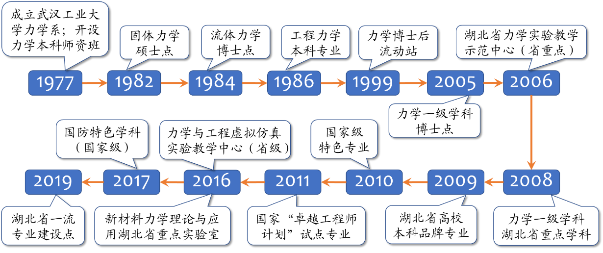 力学学科于2008年获批湖北省重点学科,2009年获批湖北省高校本科品牌专业,2010年获批国家级特色专业,2011年获批国家“卓越工程师培养计划”试点专业,2017年获批国家级国防特色学科,2019年获批省级“一流本科专业”建设点。第四轮学科评估为B-(全国排名第25-32,湖北省第2),2019年校友会全国专业排名15。