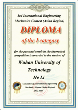 参加第三届国际大学生工程力学竞赛获个人一等奖4项二等奖7项、团体二等奖