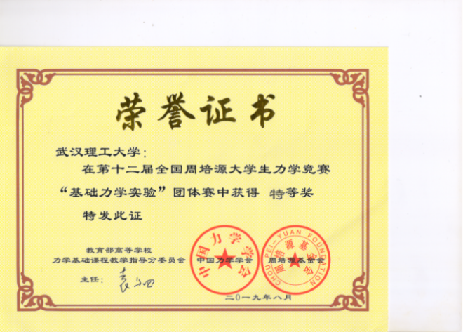 注重学生通过参与课外科技创新、科学研究和社会实践活动获得素质培养和全面发展。屡次在大学生全国周培源力学竞赛中获得佳绩,已连续七届湖北省名列前茅。2019年第十二届周培源力学竞赛中以全国第一名的成绩获得“基础力学实验团体赛”特等奖;2021年第十三届周培源力学竞赛个人赛中共有23人获得国家级奖励,并自动获得参加 “理论设计与操作”的竞赛资格;在第三届国际大学生工程力学竞赛亚洲赛区比赛中,共有11人获奖(其中一等奖4人,二等奖7人),并获得团体二等奖奖励;2023年第十三届周培源力学竞赛中获得 “理论设计与操作”团体赛二等奖,共计110人获得个人赛国家级奖励。