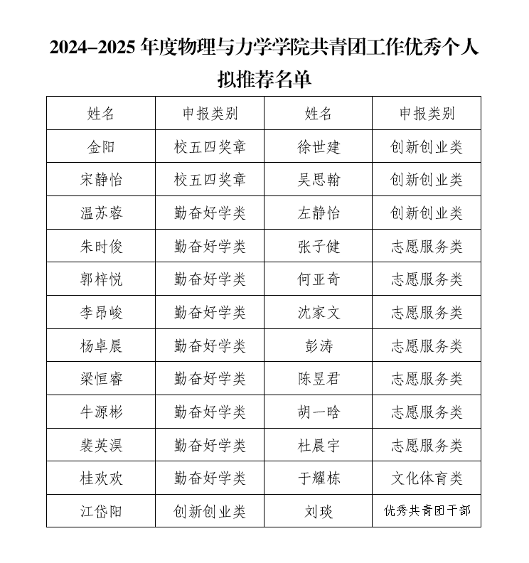 PA捕鱼官方网站2024—2025学年共青团工作先进个人拟推荐名单公示