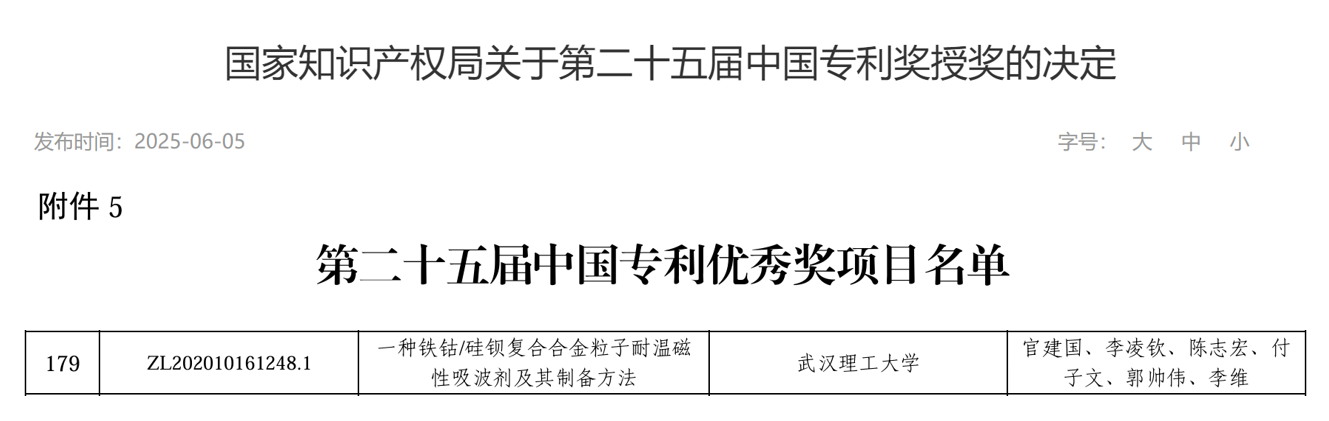 发布时间:2025-06-24近日,国家知识产权局针对在实施创新和推动经济社会发展等方面作出显著贡献的专利权人、发明人(设计人)以及相关组织者给予表彰。学院青年教师陈志宏教授作为核心骨干的专利“一种铁钴/硅钡复合合金粒子耐温磁性吸波剂及其制备方法”获第二十五届中国专利优秀奖。目前,陈志宏教授已有9项国家发明专利分别在武汉双虎涂料股份有限公司、武汉心电科技有限公司、武汉康泰威科技有限公司等多家企业实现成果转化,并入选湖北省经信厅第五批“科技副总”,助力区域经济发展
